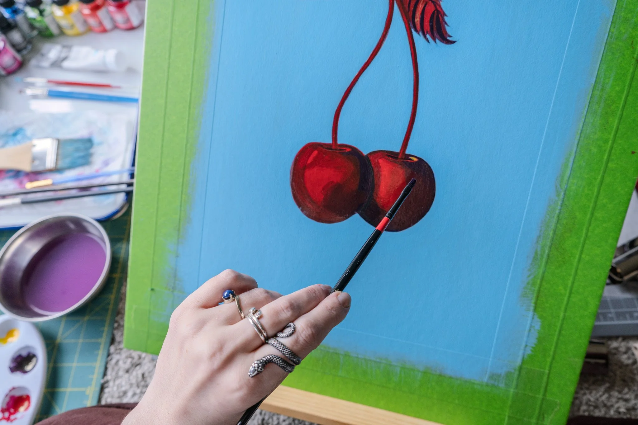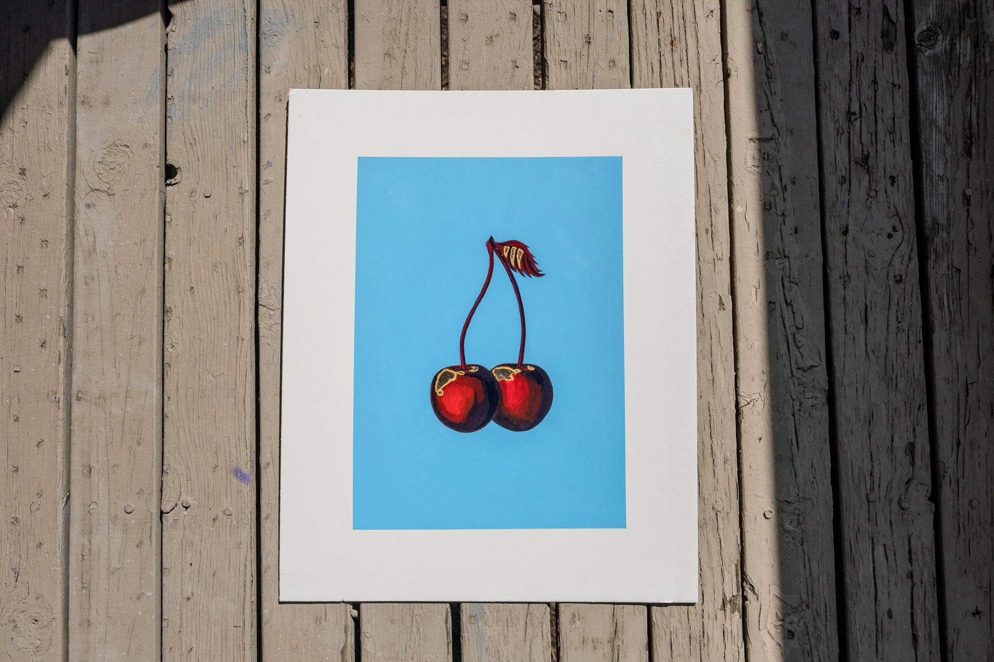 For this project, I experimented with a new medium Gold Leaf. Used for the highlights of the cherries, it didn’t come out perfect, but in the sunlight it spoke a completely different language. The reflective nature came to life when light hits.